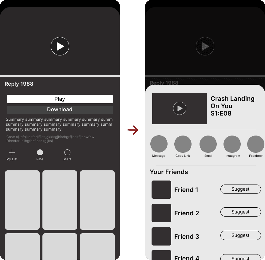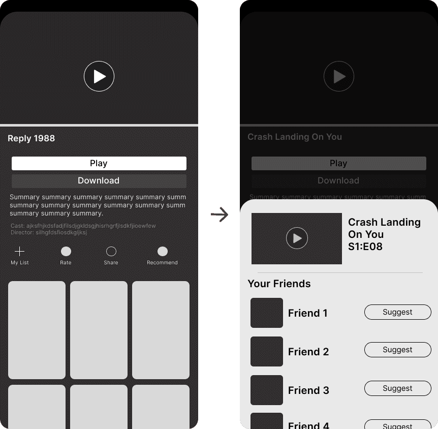 During user interviews, many participants' routes to watching a film were through personal recommendations from close ones. Using the behavior of people in close relationships wanting to suggest and enjoying suggestions from the other person, I imagined a feature where users can add each other and recommend specific films to specific friends.