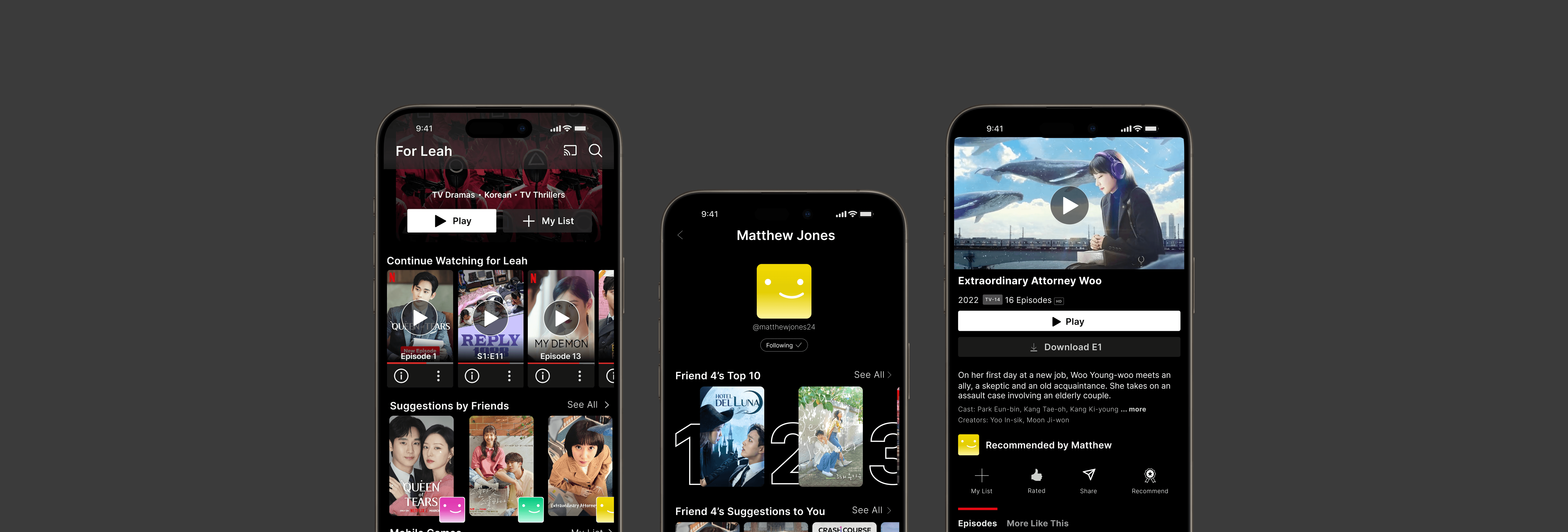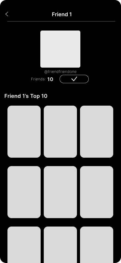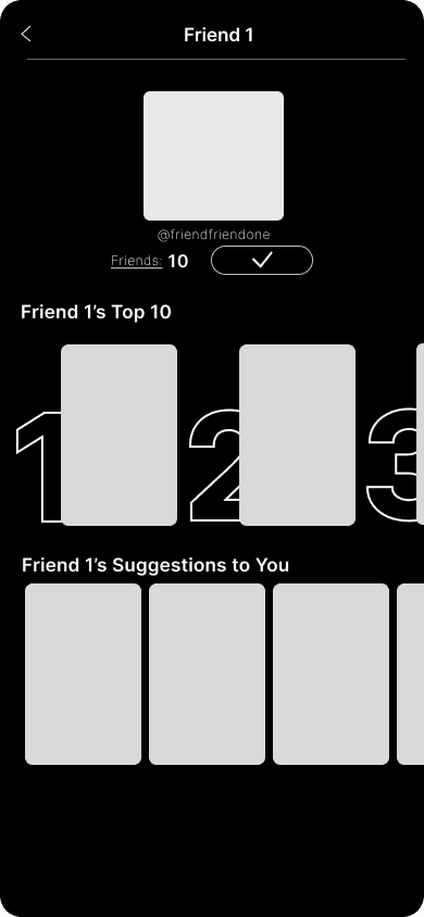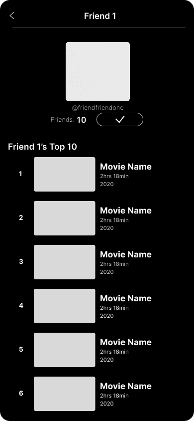 For lists and recommendations per profile, the last iteration was chosen as it provides familiarity from the home screen and also a sense of organization. It shows two different sections, a user's top ten showcasing their favorite films as well as their suggestions to you, and an option to move onto another page if the user wants an extended version.