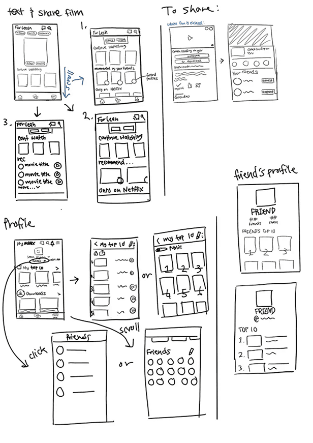 With my feature in mind, I went into sketching iterations low-fidelity screens to ideate how it would actually look like. Initially, I included Direct Messaging features but removed it later on as I wanted keep the platform private and focused to watching films. A snippet of my sketches are shown below (Left image).